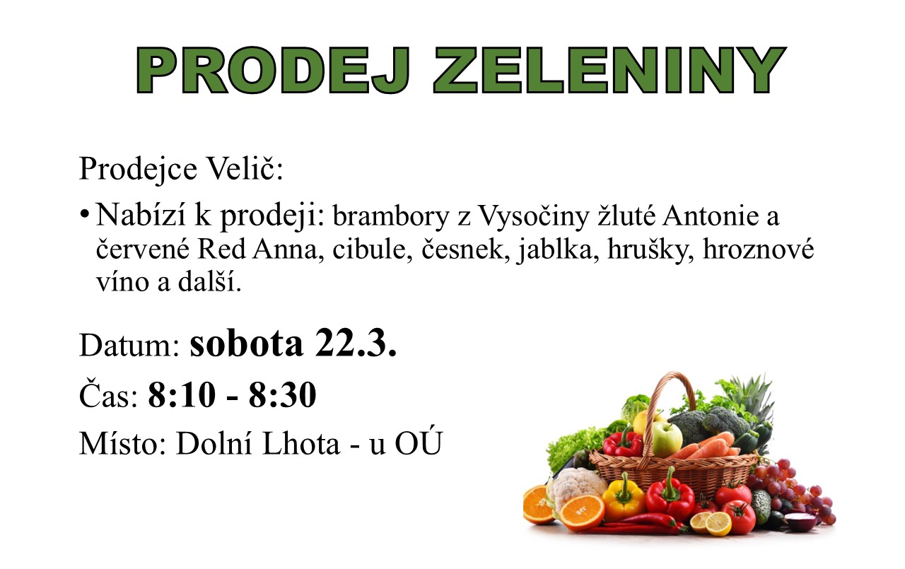 Prodejce Velič bude v sobotu 22.3. od 8:10 hod. prodávat ovoce a zeleninu.